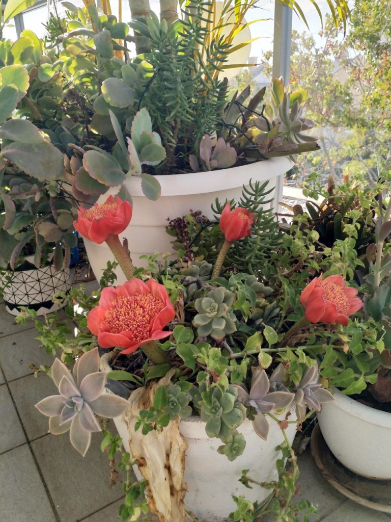 My garden is a series of overgrown pots lining the balcony. Every now and then I tidy it up but mostly it runs wild. One day I threw some succulents over the balcony but the wind blew them back and now I have succulents growing on aggregate rock on the other side of the balcony.